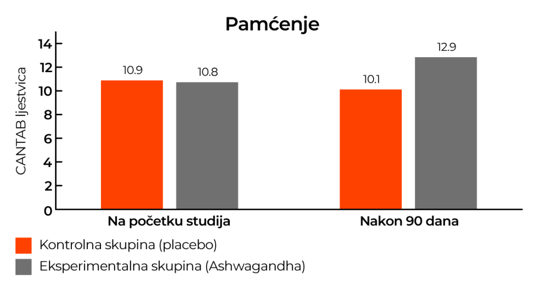 Sudionici su podijeljeni u dvije skupine, pri čemu je eksperimentalna skupina uzimala 300 mg ekstrakta korijena ashwagandhe dnevno, dok su sudionici kontrolne skupine dobivali placebo. Na početku i na kraju razdoblja istraživanja podvrgnuti su nizu testova pamćenja (CANTAB), a rezultati su na kraju uspoređeni. Studija je otkrila da dok je skupina koja je primala placebo doživjela blagi pad pamćenja, skupina koja je uzimala ashwagandhu pokazala je značajno poboljšanje. [7]