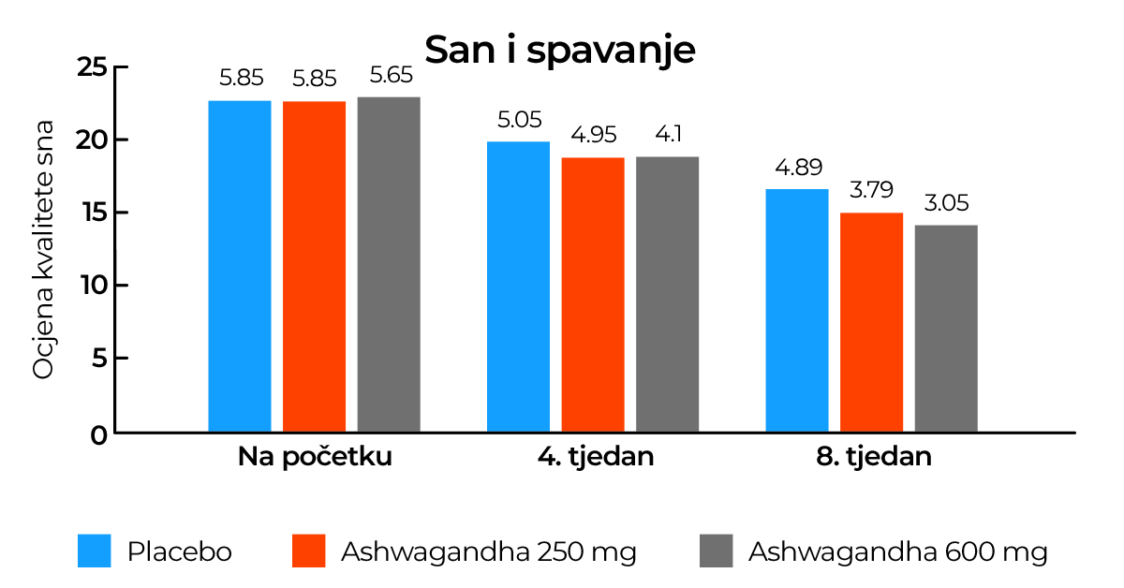 Sudionici su ocjenjivali kvalitetu svog sna na ljestvici od 1 do 7, gdje je najniža vrijednost označavala najbolju kvalitetu sna, a najviša vrijednost lošu kvalitetu sna. Nakon osam tjedana otkriveno je da se u skupinama koje su uzimale ashwagandhu kvaliteta sna poboljšala. Poboljšanje je bilo značajnije u skupini koja je konzumirala 600 mg ekstrakta u usporedbi sa skupinom koja je primala dozu od 250 mg. [16]