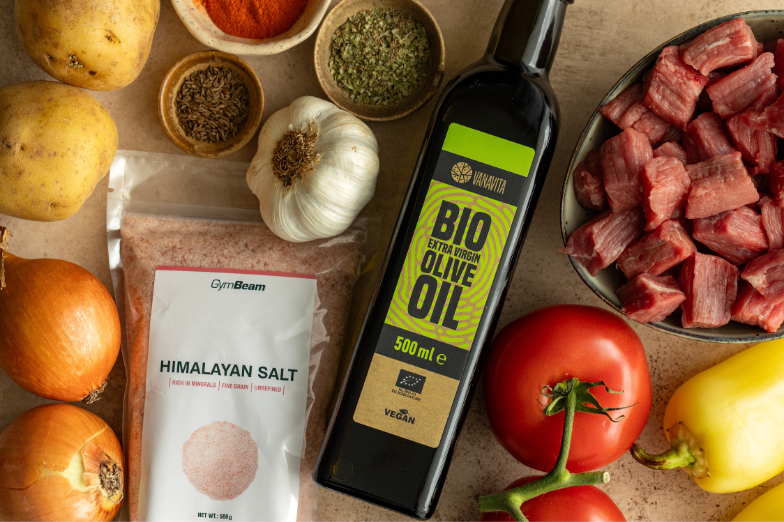 Uzmite veliki lonac, stavite ga na ringlu i pirjajte grubo nasjeckani luk na maslinovom ulju dok ne postane proziran. Dodajte govedinu narezanu na kockice, prethodno začinjenu solju, te nastavite kuhati. Zatim umiješajte papriku, dimljenu papriku, kumin i čili po želji te sve zajedno kratko popržite. Ogulite i nasjeckajte rajčice i paprike na veće komadiće pa ih dodajte u lonac. Zalijte vodom i pirjajte gulaš oko 2-3 sata, dok govedina ne omekša. U međuvremenu ogulite krumpire, nasjeckajte ga na kockice, pa dodajte u gulaš i kuhajte još 20 minuta.