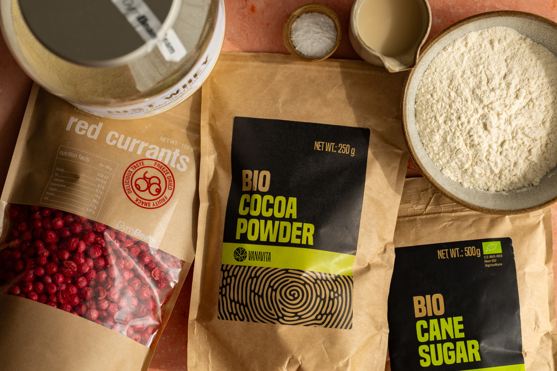 Pomiješajte brašno s proteinskim prahom, šećerom, praškom za pecivo i soli. Dodajte 60 ml mlijeka i miješajte dok ne postane glatko. Kad smjesa postane kremasta, podijelite je na dvije polovice. U jednu polovicu dodajte kakao u prahu i 10 ml mlijeka pa promiješajte da se sjedini. To će mu dati tipičnu boju. Sad možete početi s nanošenjem slojeva. Uzmite šalicu, poprskajte je uljem za kuhanje i počnite slagati slojeve dodavanjem malo tamne smjese, zatim svijetle smjese i pospite šakom liofiliziranog crvenog ribiza. Nastavite tako slagati dok ne potrošite sve tijesto.