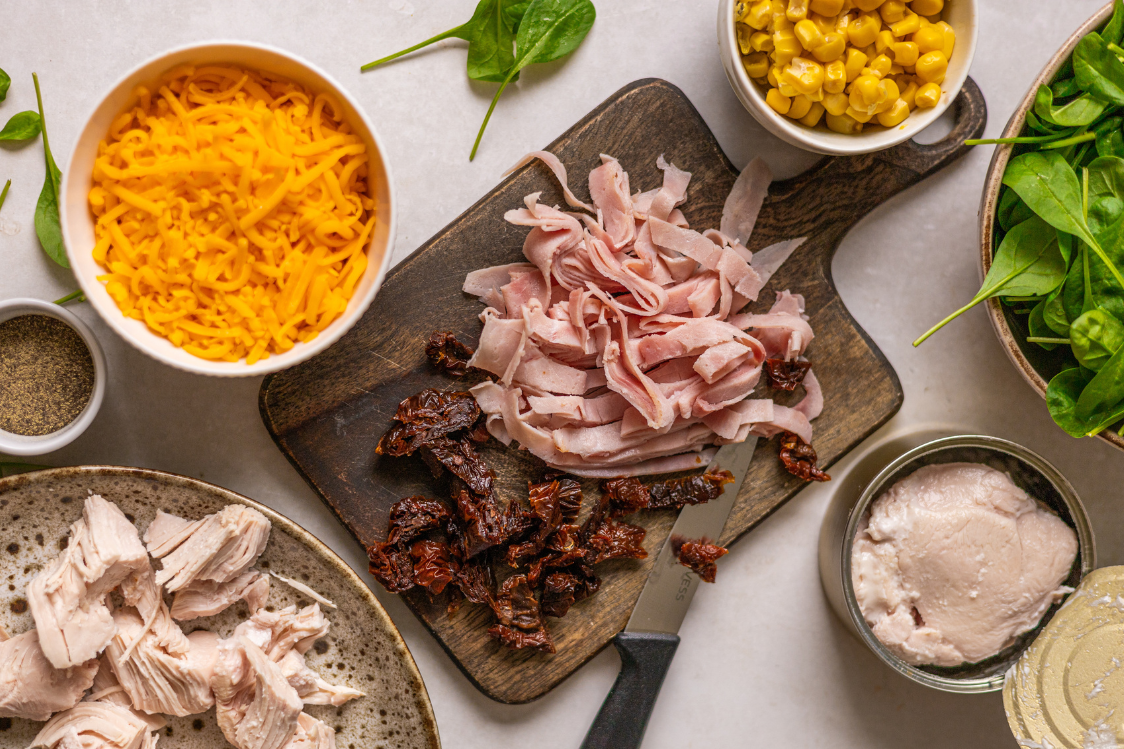 Ocijedite sav višak tekućine iz konzervirane piletine, a zatim vilicom natrgajte ili nasjeckajte meso na manje komade. Pripremite kalup za kuglof i poprskajte ga uljem za kuhanje. Ravnomjerno rasporedite trećinu pripremljene piletine po dnu kalupa i stavite ostatak u veću zdjelu. Tome dodajte preostale sastojke: bjelanjke, naribani cheddar, šunku narezanu na kockice, nasjeckane rajčice, špinat i ocijeđeni kukuruz.