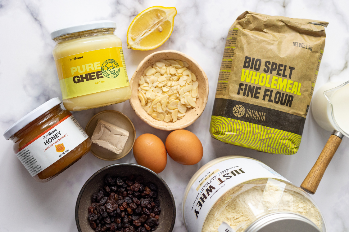 Zagrijte mlijeko u lončiću ili šalici tako da bude toplo, ali ne prevruće. U to izmrvite kvasac, dodajte 15 g meda, pomiješajte, pokrijte ubrusom i pustite da kvasac odradi svoj posao. Trebat će otprilike 15 minuta. U međuvremenu dodajte brašno pomiješano sa soli i proteinskim prahom u veliku zdjelu. Zatim dodajte aktivirani kvasac, ostatak meda, jaja, ghee, sitno naribanu koricu limuna i izradite čvrsto i glatko tijesto. Kuhinjski procesor s kukom za tijesto može značajno olakšati miješenje tijesta. Ako ga nemate, poslužite se rukama.