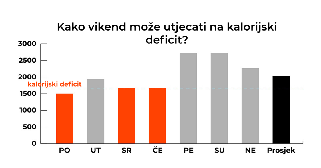 Kalorijski deficit ne pokazuje trenutne rezultate. Uzmimo za primjer Luciju koja želi izgubiti višak tjelesne masnoće i treba održavati deficit od približno 1700 kcal. Hoće li smršavjeti ako to postigne samo u jednom danu? Nažalost, ne. Da bi primijetila promjene na svom tijelu, potrebno joj je nekoliko uspješnih tjedana. Unos kalorija u osnovi se zbraja tijekom vremena i samo će prosječni unos tijekom nekoliko dana odrediti hoće li Lucija smršavjeti ili ne. Kad bi se njezin unos tijekom tjedna odražavao na grafikonu, tjelesna masnoća tvrdoglavo bi ostala na mjestu. Grafikon prikazuje tri uspješna dana u kojima je kalorijski deficit održan. Međutim, ostala četiri dana unos joj je bio veći, posebice u petak i subotu, gdje je čak za otprilike 1000 kcal premašio njen optimalni unos za mršavljenje. Nakon tjedan dana Lucijin prosječni kalorijski unos premašuje njenu optimalnu razinu za mršavljenje za otprilike 400 kcal. Kad bi tako nastavila svaki tjedan, održala bi svoju težinu i ne bi došlo do uspješnog mršavljenja.