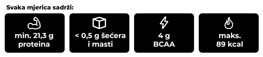 Ovisno o okusu, može se pohvaliti i do 88% udjelom visokokvalitetnih proteina koji podupiru održavanje i rast mišićne mase. Međutim, proteini također pridonose održavanju zdravih kostiju. Bonus je i činjenica da ne sadrži šećer i masti, a jedna porcija ne prelazi 90 kcal. To znači da se u njemu mogu upustiti i najzahtjevniji sportaši koji paze na svoju prehranu.