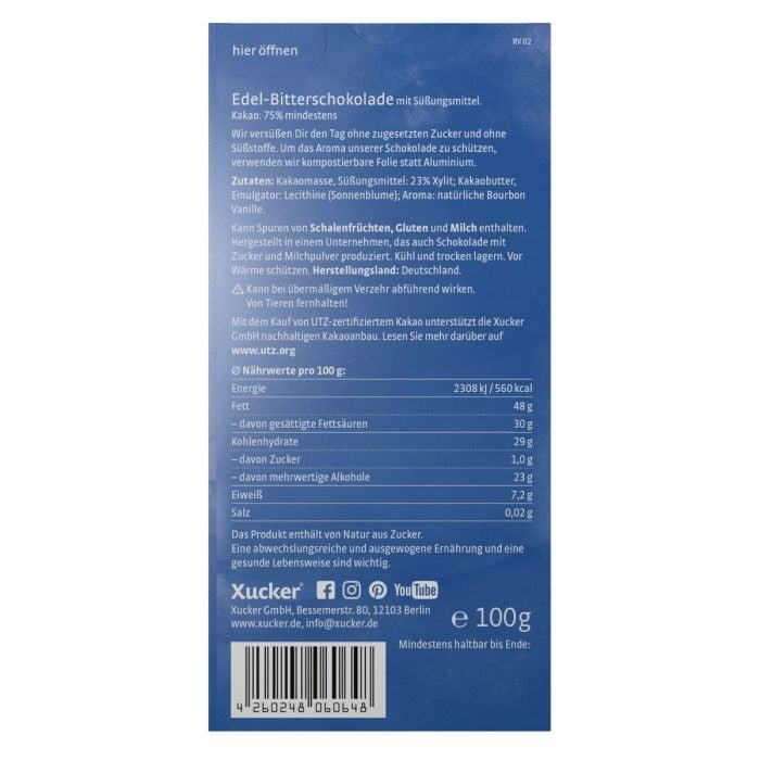 Gorka čokolada bez dodanog šećera i palminog ulja koja će vas osvojiti svojim jedinstvenim okusom. Iznimnim sastavom čokolade dominira prirodni zaslađivač ksilitol koji je sličan saharozi, ali sadrži otprilike 40 % manje kalorija. Zahvaljujući tome, čokolada je odlična alternativa za zdravo grickanje, ali je savršena i za ukrašavanje kaša, zdravih deserata ili palačinki. Pogodna je za vegane