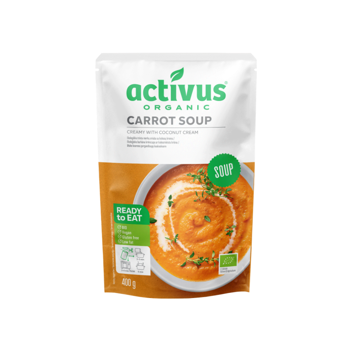 BIO Krem juha od mrkve je napravljena od bio sastojaka i cijeli proces obrade odvija se bez upotrebe kemikalija. Njena aroma i okus zadivit će vaša osjetila. Osim toga, praktična je i u njoj možete uživati bilo gdje. Odmah je spremna za konzumaciju, ali najbolje ju je zagrijati prije konzumacije. Juha ne sadrži konzervanse i alergene, stoga će zadovoljiti svakog ljubitelja zdrave hrane. Nadalje, juha ima moderno pakiranje, koje je ekološki prihvatljivo i čini znatno manje emisije CO2 tijekom svog životnog ciklusa u usporedbi s uobičajenom staklenom posudom.